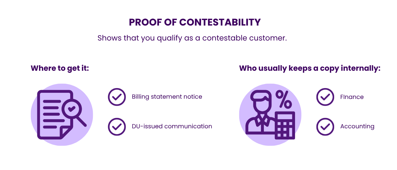 Some DUs issue a notification or use your billing statement as proof that you qualify as a contestable customer.