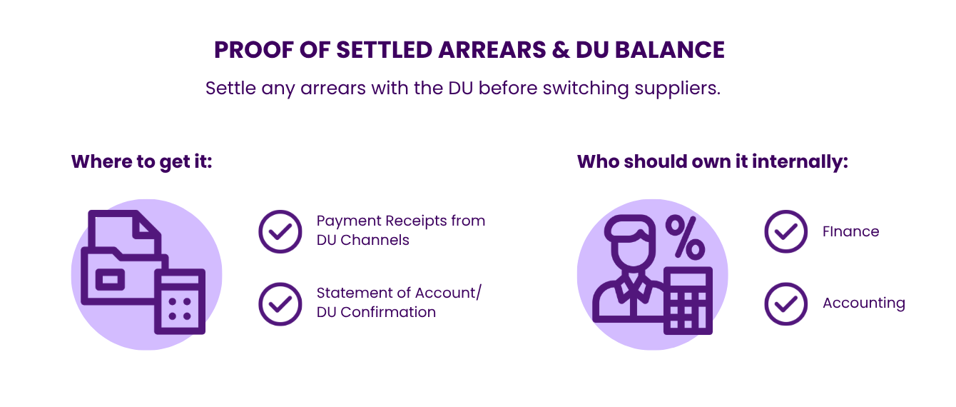 Below are the most common requirements referenced in DU switching guides and RCOA onboarding timelines.