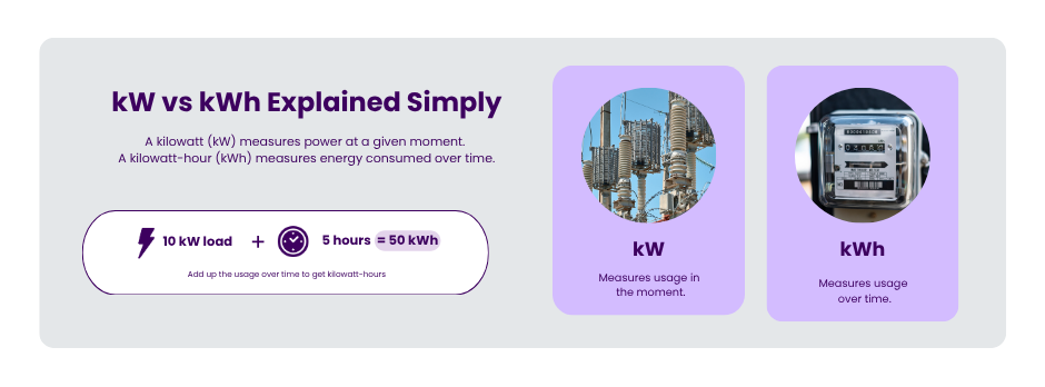 A simple way to picture it is this: kW is how hard your equipment is working right now, while kWh is how much electricity you used over the day, week, or month. A 10 kW load running for 5 hours uses 50 kWh. So if kW is the rate, kWh is the accumulated total.