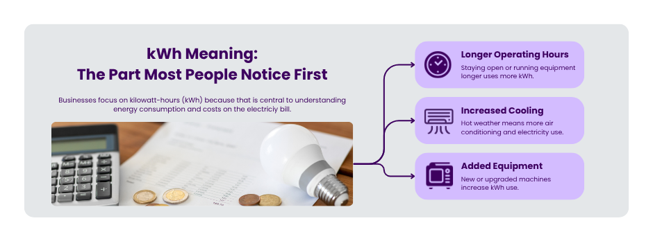 If your store, warehouse, office, or plant operates longer hours, adds equipment, or ramps up cooling during hot months, your kWh can rise simply because more electricity is being used over more time. That makes kWh a major cost driver for many accounts.